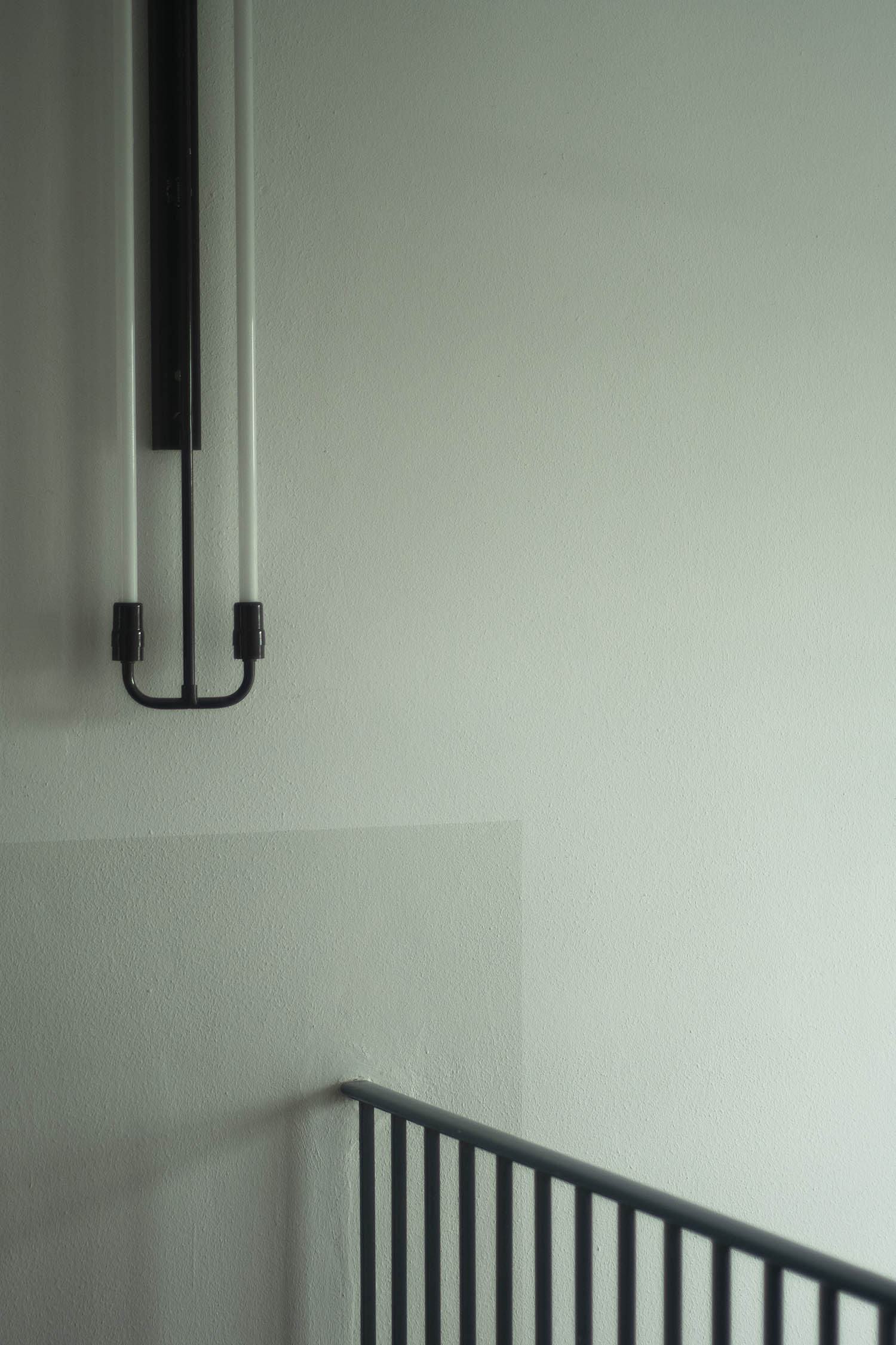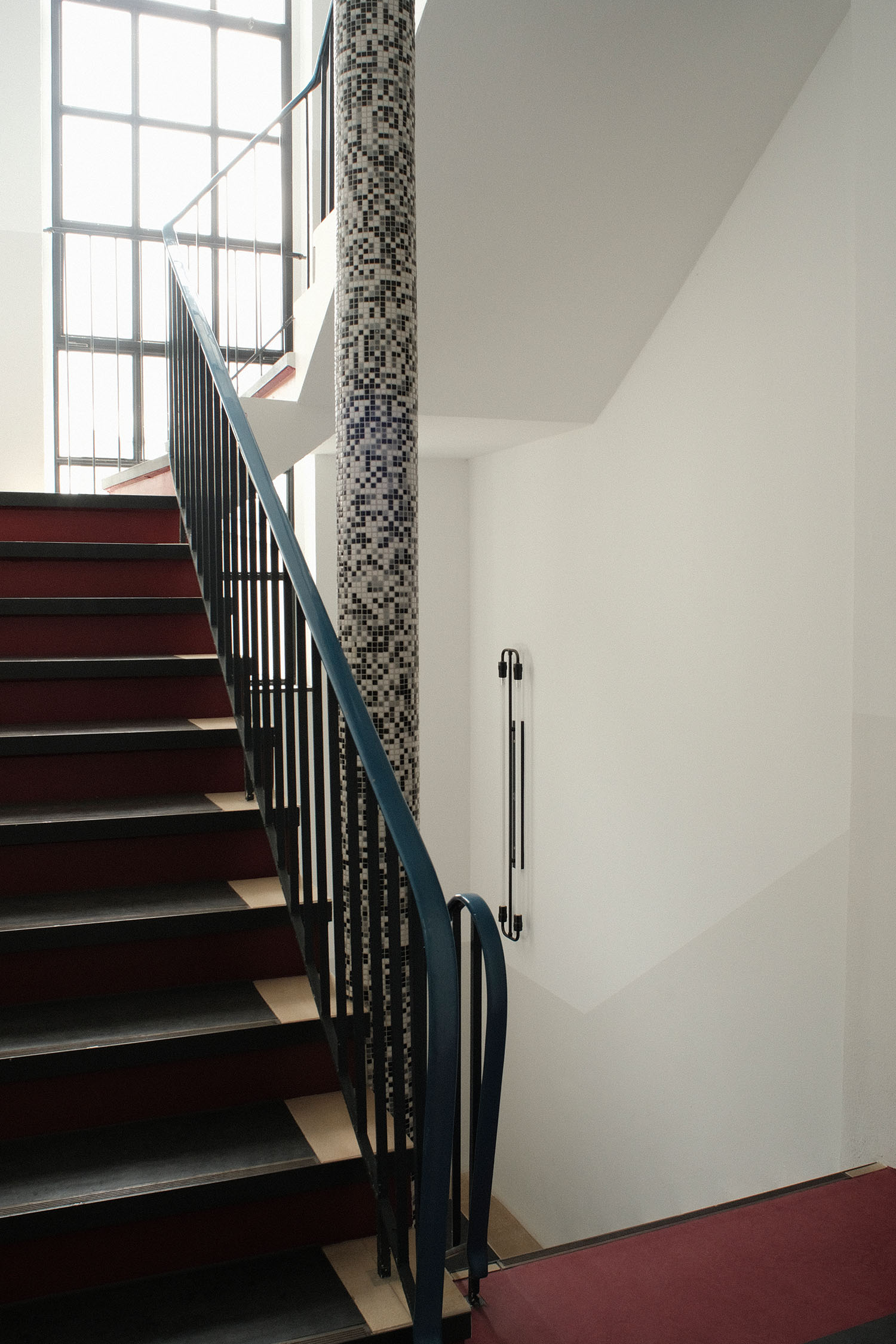 Treppenaufgang des Bürohauses nach der behutsamen Renovierung mit Ebolicht Leuchtmitteln, Solnhofer Platten, Linoleum und Fensterprofil von Ottostumm.